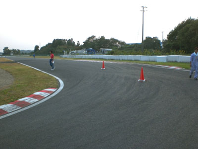 そして本日のキモだった2コーナー出口のシケイン風パイロン2本はそのままで,ストレートを走り抜け,本日はフリー状態だった3-4コーナーにはラインを大きく外した規制パイロンが立ってます。通常のラインのかなり外側を大きく回り込む形になります。